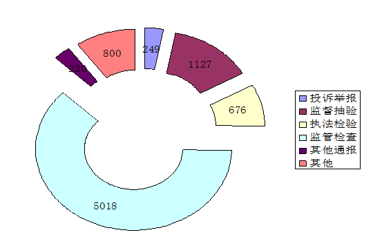 从案件来源看,投诉举报249件,监督抽验1127件,执法检验676件,日常监管和专项检查5018件,其他部门通报230件,其他800件。