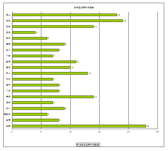 行政机构中,成都数量最多,共23个;资阳数量较少,为4个。副省级行政监管机构1个,成都局;市州级行政监管机构20个,除成都外各地分别一个。全省共有县区级行政监管机构195个,成都最多,22个;最少的资阳仅3个。