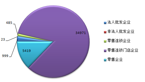 图4-1-1 2017年全省药品审批情况分布图 二、药品经营企业许可情况截至2017年,全省共有药品经营企业41897家,其中法人批发企业999家,非法人批发企业23家,零售连锁企业485家,零售连锁门店企业34971家,零售企业5419家。