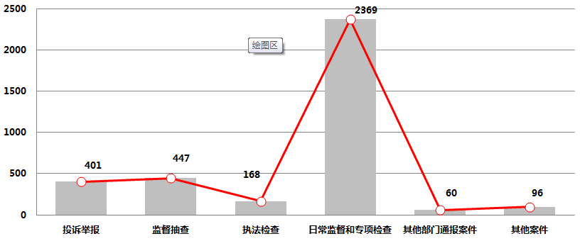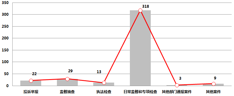 图4-5-1 全省药品生产企业日常监管情况 六、药品案件查处情况2017年,各级监管机构共查处违法药品案件总数3541件,其中一般程序案件2031件,简易程序案件1510件,货值金额907.37万元,罚款金额1075万元,没收违法所得金额524.89万元;取缔无证经营6户,捣毁制假售假窝点1个,责令停产停业16户,吊销经营许可证1件,移送司法机关案件数36件。 从案件来源看,投诉举报401件,监督抽验447件,执法检验168件,日常监管和专项检查2369件,其他部门通报60件,其他96件。