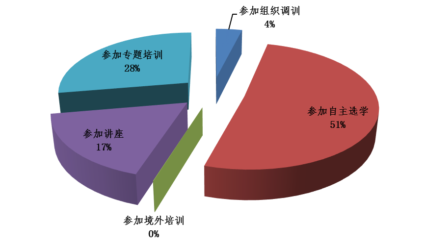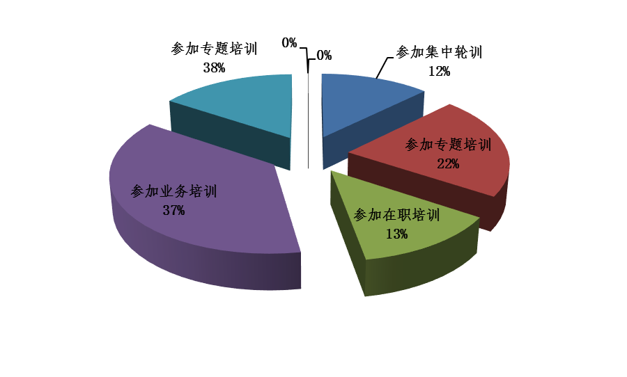 图1-2-3 2017年全省专业技术人员职称情况图 三、培训情况(一)行政机构干部教育培训情况2017年食品药品监管系统行政机构干部教育培训情况: 按照培训方式分为:集中轮训、专题培训、初任培训、任职培训、在职培训、专门业务培训、网络培训、境外培训等8种方式。以上8项培训合计:参加培训总人数10927人、54104人次、697759学时。 按照培训渠道分为:党校行政院校干部学院培训、系统培训机构培训、单位内部培训、高等学校培训、国家总局网络培训和社会其他培训机构培训等。