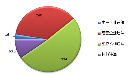 图6-2-1 2017年全省博天堂娱乐案件查处情况分布图 从违法主体看,生产企业违法16件,经营企业违法240件,医疗机构违法334件,其他违法63件。