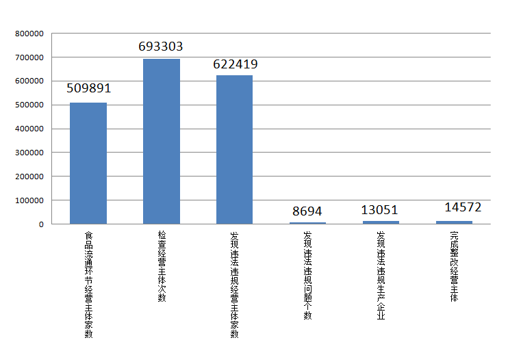 图2-1-2 2017年全省食品种类划分图 (二)食品日常监管情况1、食品生产环节日常监管情况 2017年,全省日常监管工作中,共检查食品生产企业24623家、食品添加剂生产企业472家、食品加工小作坊44551家。出动检查人员181517人次,其中食品生产企业76103人次,食品添加剂生产企业2344人次,食品加工小作坊103070人次。快检食品批次数7566批次,其中食品生产企业4543批次,食品添加剂生产企业233批次,快检食品加工小作坊2790批次。 日常监督检查中发现违法违规问题数5809个,其中食品生产企业1899个,食品添加剂生产企业22个,食品加工小作坊3888个;食品生产企业问题移交稽查部门立案查处285件,食品添加剂生产企业问题移交稽查部门立案查处12件,食品加工小作坊问题移交稽查部门立案查处239件。 2、食品经营环节日常监管情况 2017年,全省各级监管机构共检查食品流通环节经营主体509891家,检查经营主体次数693303家次,出动检查人次622419人次,发现违规违法经营主体8694家,发现违法违规问题数13051个,完成整改经营主体14572家。“明厨亮灶”实施户数195981家,量化分级评定总数218633家,其中优秀13742家,良好119839家,一般238890家。