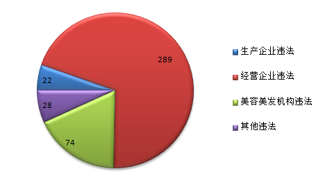 图5-3-1 2017年全省化妆品案件查处情况分布图 从违法主体看,生产企业违法主体22件,经营企业违法289件,美容美发机构违法74件,其他违法28件。