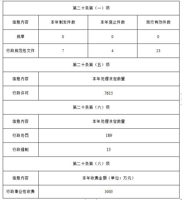一、总体情况 按照《中华人民共和国918博天堂条例》有关规定,编制本年度报告。本报告数据统计期限为2023年1月1日至2023年12月31日。 (一)概况 2023年,918博天堂坚持以席大大新时代中国特色社会主义思想为指导,深入贯彻落实《中华人民共和国918博天堂条例》和省委省政府关于918博天堂的部署要求,紧紧围绕药品监管职责和重点工作任务,不断提高药品监管领域918博天堂工作的质量和成效。 (一)信息主动公开情况。918博天堂坚持“公开为常态、不公开为例外”的原则,持续加大公开力度,切实满足人民群众获取政府信息的合理需求。918博天堂门户网站转载时政要闻2448条,发布工作通知、监管动态、科普园地、消费提示等信息386条,信息公开目录更新124条。发挥政务新媒体传播优势,通过微信、微博等发布信息7100余条,关注量和订阅数达17.6万。坚持走好网上群众路线,密切关注网民声音,及时办理局长信箱、问政四川、麻辣社区等留言216条。围绕《四川省药品零售经营监督管理办法》《药品零售连锁总部检查细则》等16个文件进行政策解读。发布药品、博天堂娱乐、化妆品抽检信息8期,产品召回信息6期。 (二)依申请公开办理情况。2023年,共收到依申请公开事项4件,结转下年度继续办理0件,其中自然人申请2件,企业申请2件;予以公开的2件,部分公开0件,不予公开2件。在办理依申请公开过程中,持续提升依申请公开服务能力,畅通受理渠道,提升服务水平,加强与申请人沟通,做好解疑释惑工作,均在规定期限内办结回复。 (三)政府信息管理情况。严格执行省局918博天堂管理办法等规定,进一步健全内容审核和信息发布审核机制,压紧压实各方审查责任,对拟公开的内容严格进行规范性审核和保密审查。持续动态更新、规范发布规范性文件及有关工作文件,进一步做好涉药品监管建议提案答复、规划、许可、部门预决算、行政执法等法定政府信息的主动公开工作。2023年,制发行政性规范文件7件,废止4件,现行有效23件。 (四)平台建设情况。严格按照政务公开有关要求,不断调整优化栏目设置,聚焦“两会”及药品安全集中宣传等重要工作设置相关专题专栏,进一步丰富宣传渠道,加大公开力度。如开设“化妆品科普宣传周”专栏,发布省、市(州)活动动态104条。 (五)监督保障情况。持续组织相关人员学习《中华人民共和国918博天堂条例》,不断提高对918博天堂工作的认识和工作能力水平。加强对门户网站的可访问性、链接可用性、页面显示完整性等进行例行巡检,排查、清理失效链接38个。建立安全监测预警机制,认真组织应急演练,全年进行安全监测评估12次。 二、主动公开政府信息情况